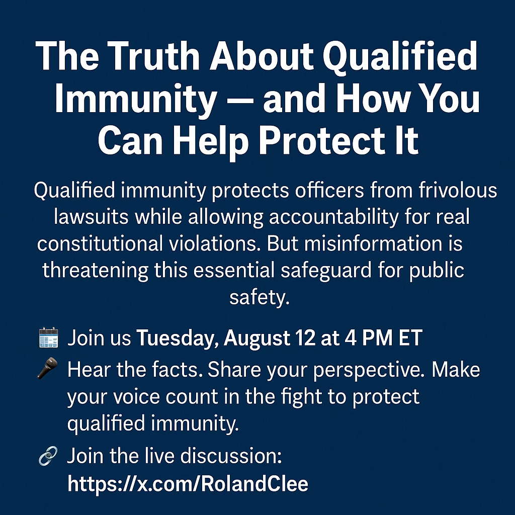 That’s why fellow coalition member Cori Huston and I have set up virtual town hall via X (formerly Twitter) Spaces on Tuesday, August 12 at 4 p.m. ET. We are building this aircraft in flight so we will learn as we go. If you are on X already, find me @RolandClee and you will be notified when the Space goes live. We look forward to listening to you about qualified immunity.